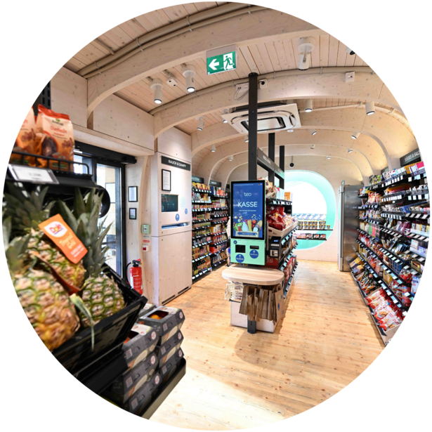 Die modulare Holzbauweise ermöglicht teo einen nachhaltigen und schnellen Bezug von bestehenden Flächen. Die organische und freundliche Architektur zeigt sich hier im Holzdesign an den Regalen, welches bis zu den Decken hinaufreicht, bietet Dir ein Einkaufserlebnis zum Wohlfühlen und ist nachhaltig zugleich. Eine von teos Besonderheiten ist der begehbare Kühlbereich, der Dir direkten Zugriff auf Kühlprodukte ermöglicht und dabei einen neuen und nachhaltigen Maßstab setzt.