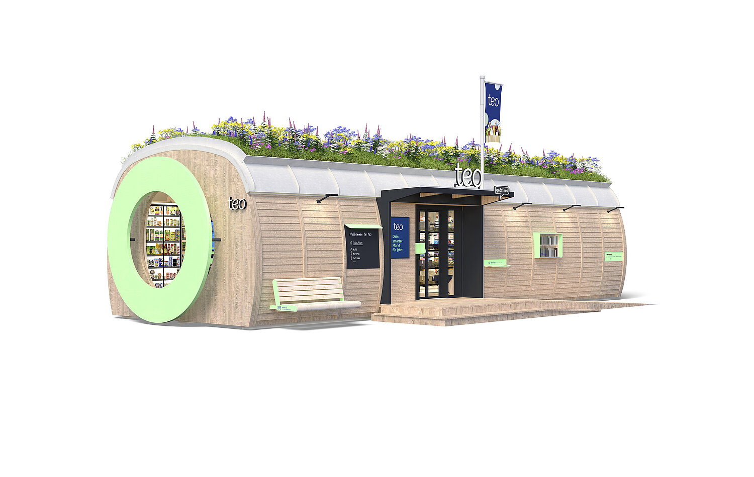 Der Holzbaukörper von teo besteht zu 95% aus nachwachsenden Baustoffen – das sieht nicht nur toll aus, sondern ist auch nachhaltig. Das Gründach aus Wildblumen und Gräsern sowie der Korpus aus Holz machen teo absolut einzigartig und bieten Bienen und Insekten einen neuen Lebensraum, vor allem in urbanen Gegenden. Dafür wurde teo 2022 mit dem deutschen Nachhaltigkeitspreis ausgezeichnet.